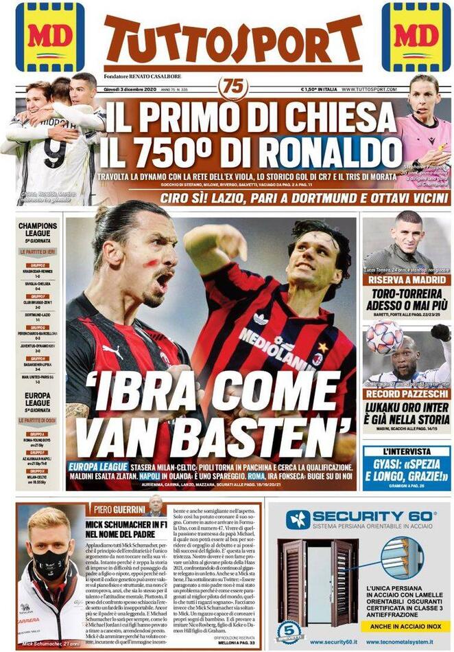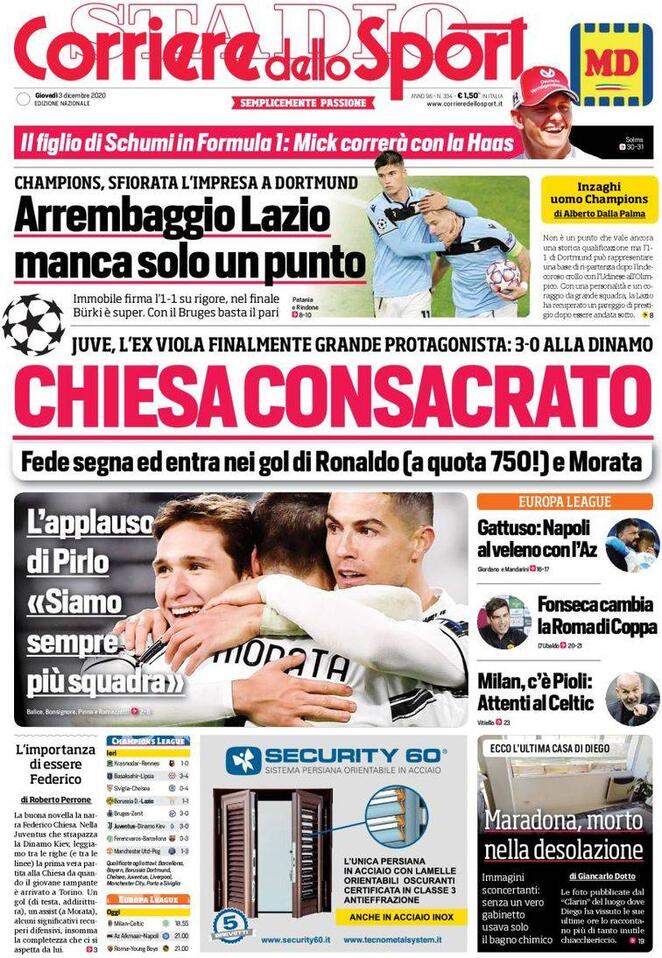 Le prime pagine dei quotidiani sportivi del 3-12-2020