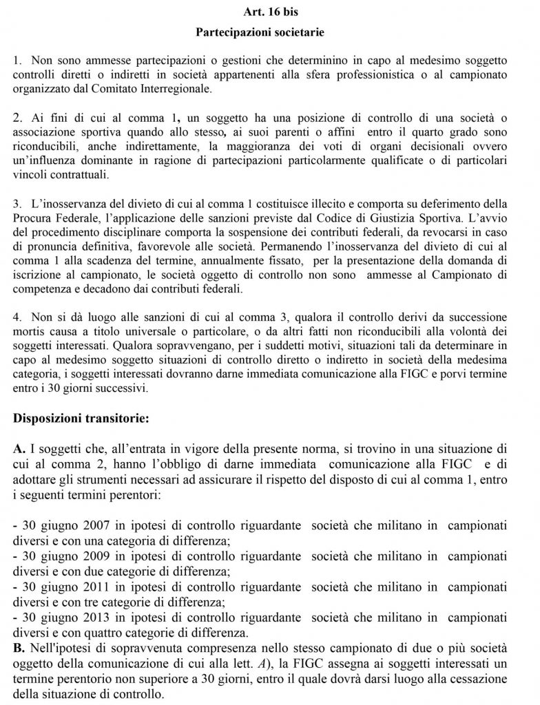 In attesa di maggiori sviluppi, ecco l’articolo 16 bis delle Noif dello scorso luglio.
