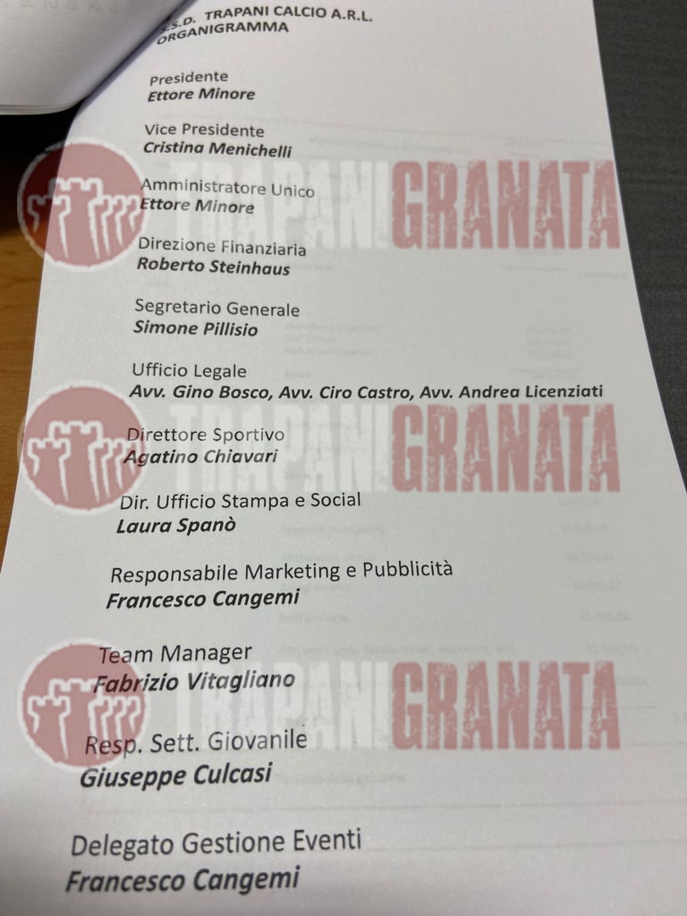Teniamo a precisare, per rispetto dei nomi elencati nell’organigramma in questione, che nel frattempo ci sono state delle variazioni e !a divulgazione non autorizzata di tale documento sta creando situazione incresciose ai professionisti chiamati in causa. Quindi diffidiamo di divulgare ulteriormente tale documento e specifichiamo che l’organigramma definitivo verrà presentato alla prima conferenza stampa utile dalla SSD Trapani 1905 a.r.l., non prima”.